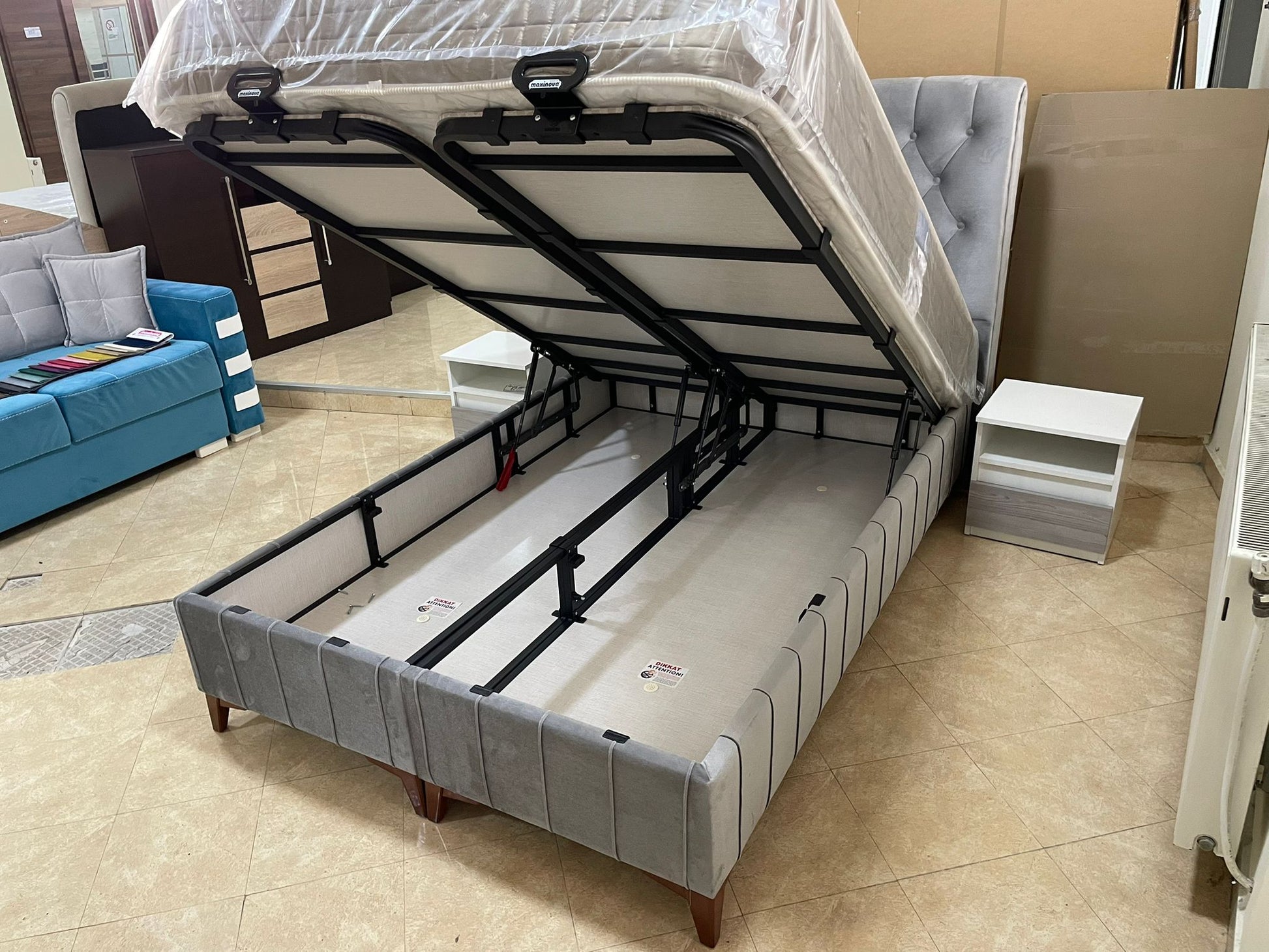 • Structura metalica, pal, tapiterie stofa premium.